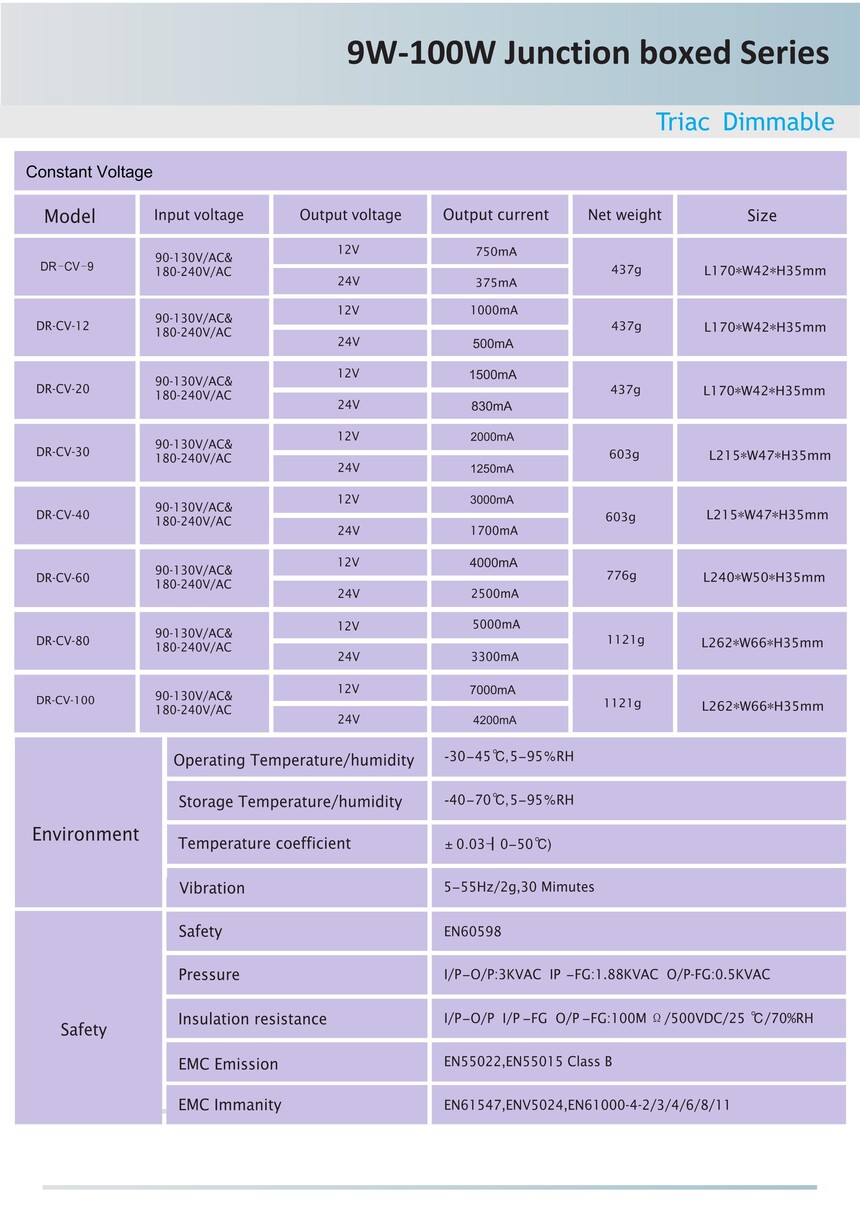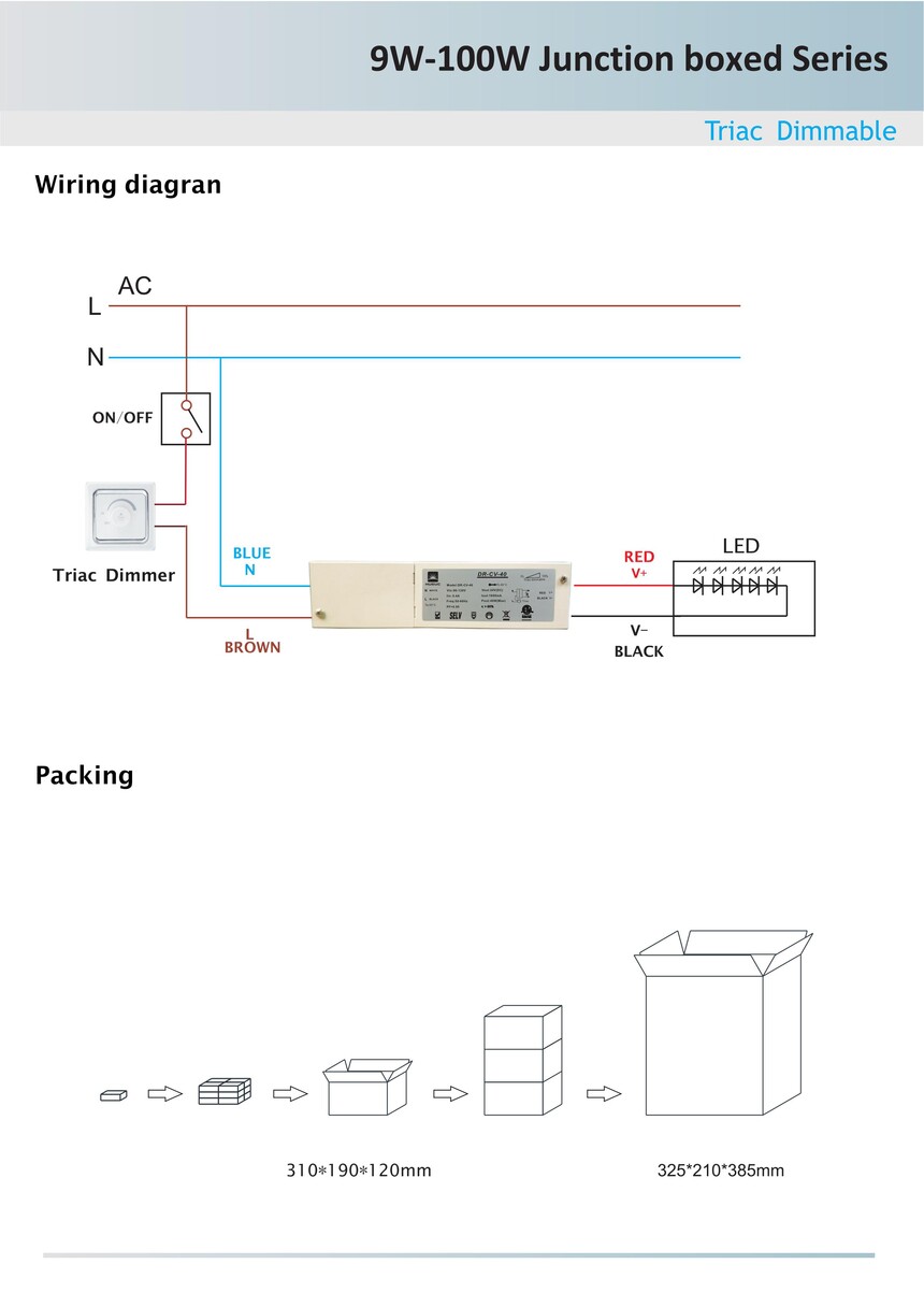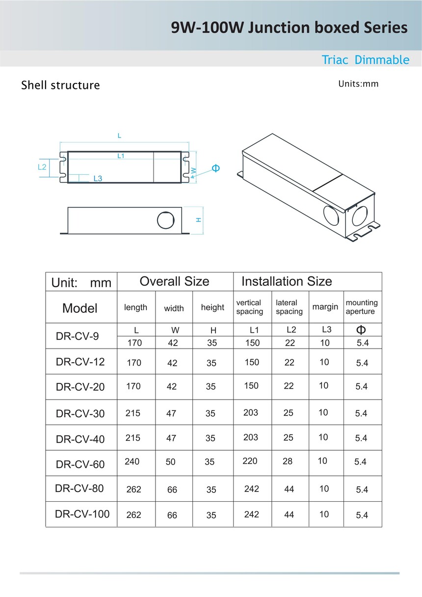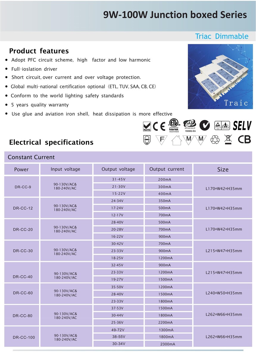 Junction Box Triac Dimmable Led Driver Constant Voltage for Led Lighting 1). Selectable constant voltage /constant current output upon request. 2). Fully-isolated. 3). Short-circuit, over-current and over -voltage protection. 4). Fireproof environmental protection PC housing cover. 5). 5 years warranty. 6). Ruby capacitors. 7). Compatible with front and trailing dimming. 8). Highly energy saving. 9). CE/ RoHS/SAA /cETLus/TUV/3C certified. 10). Customized logo by laser printing on housing. 11). Dimming range 5%-100%. 12). PF>0.95 & Efficiency>86%. 13). No flickering or flashing. 14). Small quantity acceptable for your testing purpose. 15). Factory direct to ensure best price and 8-15 days' delivery. Class II constant voltage TRIAC Dimmable LED Driver . AC input 100-130 volt, DC output 12 volt, 20W-80W option available, 50/60Hz. Made of flame retardant materials with a high degree of fire resistance capability. Easy to install and wire up. No humming, light flicker or switch on delay from the transformer. Low power design, static power consumption, low calorific value. Note: For maximum dimming effectiveness and performance, please load the driver to at least 70% of its capacity.