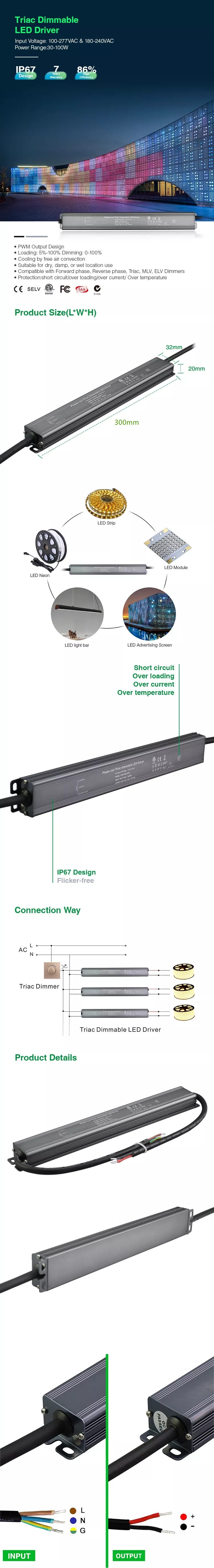 Triac Dimmable Led Driver Constant Voltage for Led Lighting 12V 12W 20W 30W 40W 60W 80W 100W 150W 24V 12W 20W 30W 40W 60W 80W 100W 150W 1). Selectable constant voltage /constant current output upon request. 2). Fully-isolated. 3). Short-circuit, over-current and over -voltage protection. 4). Fireproof environmental protection PC housing cover. 5). 5 years warranty. 6). Ruby capacitors. 7). Compatible with front and trailing dimming. 8). Highly energy saving. 9). CE/ RoHS/SAA /cETLus/TUV/3C certified. 10). Customized logo by laser printing on housing. 11). Dimming range 5%-100%. 12). PF>0.95 & Efficiency>86%. 13). No flickering or flashing. 14). Small quantity acceptable for your testing purpose. 15). Factory direct to ensure best price and 8-15 days' delivery. Class II constant voltage TRIAC Dimmable LED Driver . AC input 100-130 volt, DC output 12 volt, 20W-80W option available, 50/60Hz. Made of flame retardant materials with a high degree of fire resistance capability. Easy to install and wire up. No humming, light flicker or switch on delay from the transformer. Low power design, static power consumption, low calorific value. Note: For maximum dimming effectiveness and performance, please load the driver to at least 70% of its capacity.