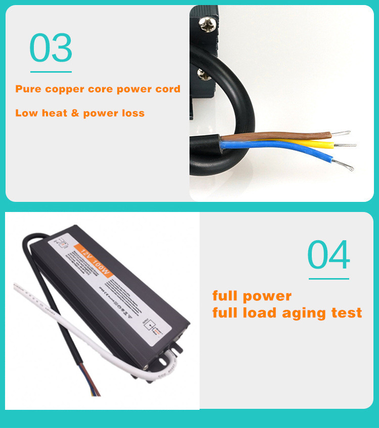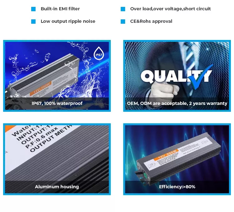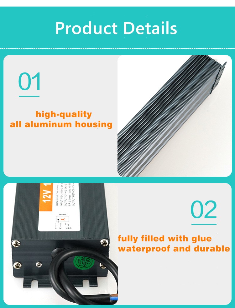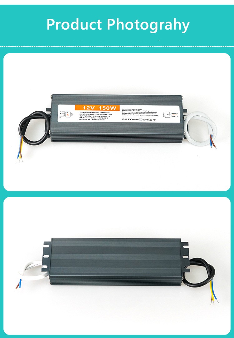 12V 24V 150W Waterproof Power Supply Constant Voltage Feature * 1. 2-year warranty * 2. 0.3-0.5% defective rate * 3. 100% inspection and testing prior to each shipment * 4. Full protection: shortcut, overload, over-current and over-temperature * 5. High efficiency ≥83% * 6. 100% replacement of the defective goods * 7. Flexible and fast delivery time * 8. With the newest international standard CE, ROHS, FCC, SAA and CB certificates * 9. 24 hours online service * 10. OEM&ODM service for specific demands * 11. High quality with competitive prices * 12. Logo customization available * 13. Small quantity acceptable * 14. Consolidated packaging to ensure transport security * 15. 100% customers’ satisfaction Scope: Widely used on many kinds of LED lights 1. Suitable for all-weather,working temperature range:-40°C~+50°C 2. All series are equipped with power factor compensation,high efficiency and energy saving. 3. Small size design,easy assembly and maintain constant high conversion efficiency. 4. High quality raw materials and electronic components to esnure quality consistency 5. First-class craftsmanship and strict quality control management