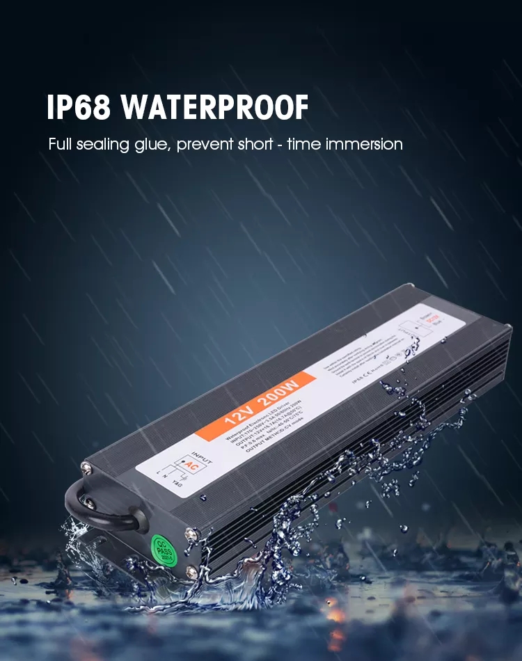 12V 24V 200W Waterproof Power Supply Constant Voltage Feature * 1. 2-year warranty * 2. 0.3-0.5% defective rate * 3. 100% inspection and testing prior to each shipment * 4. Full protection: shortcut, overload, over-current and over-temperature * 5. High efficiency ≥83% * 6. 100% replacement of the defective goods * 7. Flexible and fast delivery time * 8. With the newest international standard CE, ROHS, FCC, SAA and CB certificates * 9. 24 hours online service * 10. OEM&ODM service for specific demands * 11. High quality with competitive prices * 12. Logo customization available * 13. Small quantity acceptable * 14. Consolidated packaging to ensure transport security * 15. 100% customers’ satisfaction Scope: Widely used on many kinds of LED lights 1. Suitable for all-weather,working temperature range:-40°C~+50°C 2. All series are equipped with power factor compensation,high efficiency and energy saving. 3. Small size design,easy assembly and maintain constant high conversion efficiency. 4. High quality raw materials and electronic components to esnure quality consistency 5. First-class craftsmanship and strict quality control management