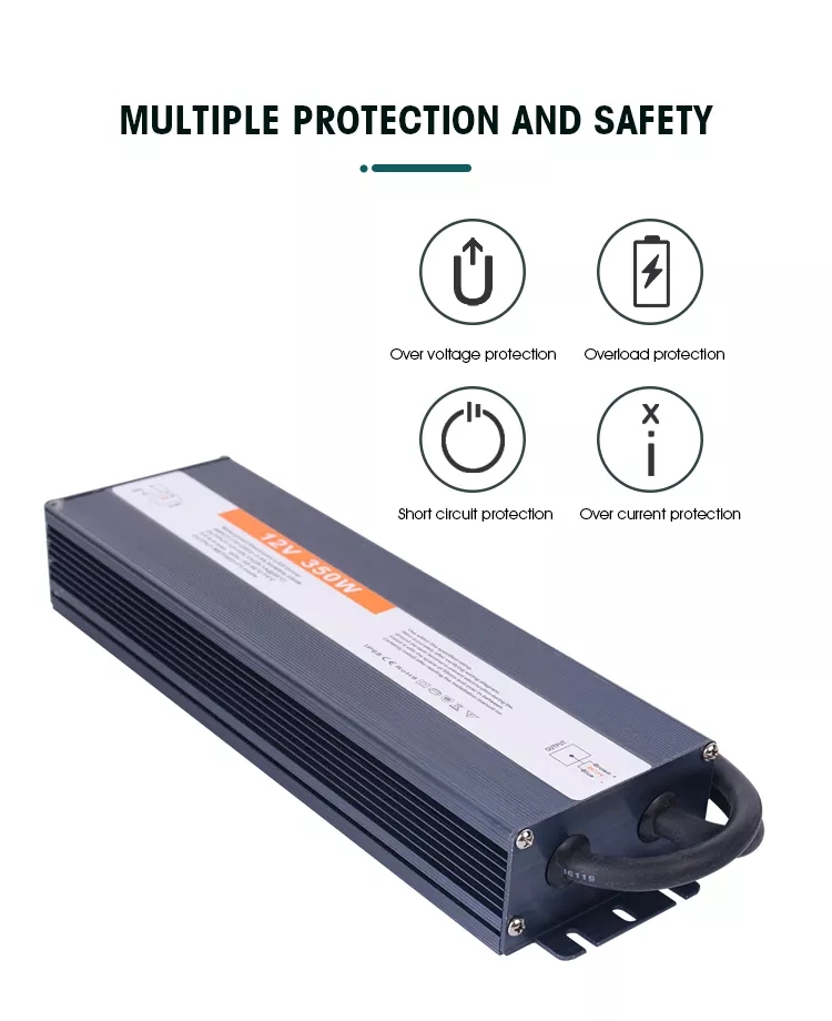 12V 24V 350W Waterproof Power Supply Constant Voltage Feature * 1. 2-year warranty * 2. 0.3-0.5% defective rate * 3. 100% inspection and testing prior to each shipment * 4. Full protection: shortcut, overload, over-current and over-temperature * 5. High efficiency ≥83% * 6. 100% replacement of the defective goods * 7. Flexible and fast delivery time * 8. With the newest international standard CE, ROHS, FCC, SAA and CB certificates * 9. 24 hours online service * 10. OEM&ODM service for specific demands * 11. High quality with competitive prices * 12. Logo customization available * 13. Small quantity acceptable * 14. Consolidated packaging to ensure transport security * 15. 100% customers’ satisfaction Scope: Widely used on many kinds of LED lights 1. Suitable for all-weather,working temperature range:-40°C~+50°C 2. All series are equipped with power factor compensation,high efficiency and energy saving. 3. Small size design,easy assembly and maintain constant high conversion efficiency. 4. High quality raw materials and electronic components to esnure quality consistency 5. First-class craftsmanship and strict quality control management