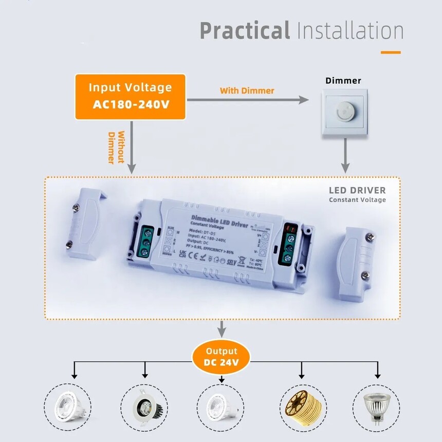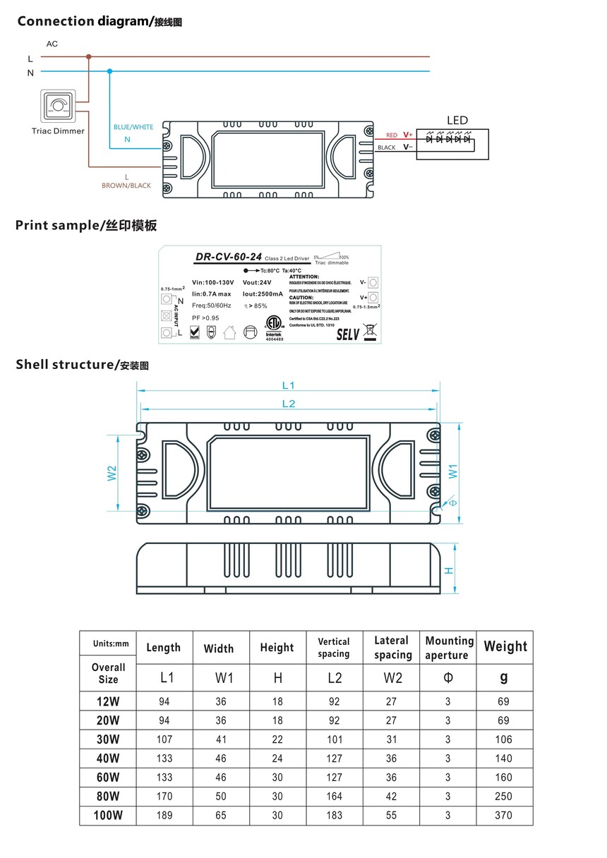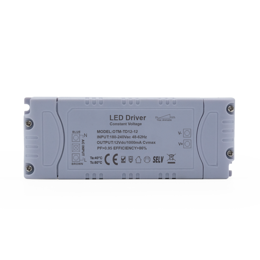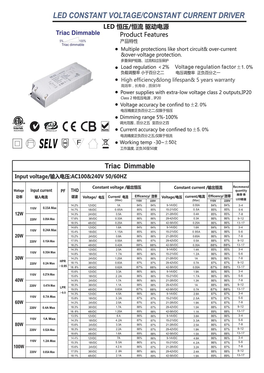 =12W = Triac Dimmable Led Driver Constant Voltage /Constant Current 1). Selectable constant voltage /constant current output upon request. 2). Fully-isolated. 3). Short-circuit, over-current and over -voltage protection. 4). Fireproof environmental protection PC housing cover. 5). 5 years warranty. 6). Ruby capacitors. 7). Compatible with front and trailing dimming. 8). Highly energy saving. 9). CE/ RoHS/SAA /cETLus/TUV/3C certified. 10). Customized logo by laser printing on housing. 11). Dimming range 5%-100%. 12). PF>0.95 & Efficiency>86%. 13). No flickering or flashing. 14). Small quantity acceptable for your testing purpose. 15). Factory direct to ensure best price and 8-15 days' delivery. Class II constant voltage TRIAC Dimmable LED Driver . AC input 100-130 volt, DC output 12 volt, 20W-80W option available, 50/60Hz. Made of flame retardant materials with a high degree of fire resistance capability. Easy to install and wire up. No humming, light flicker or switch on delay from the transformer. Low power design, static power consumption, low calorific value. Note: For maximum dimming effectiveness and performance, please load the driver to at least 70% of its capacity.