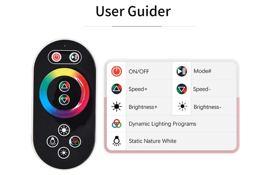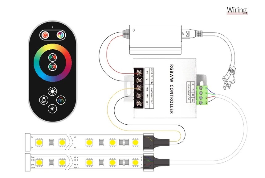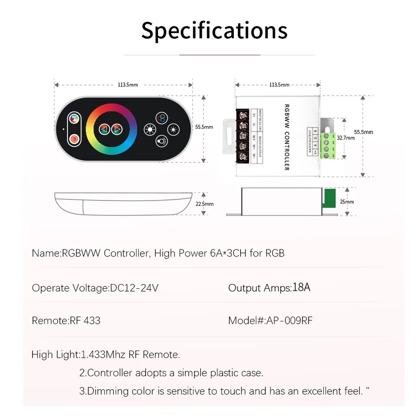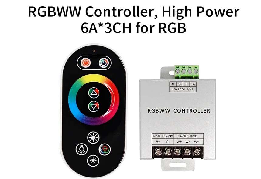 high power led controller 12v 24v rgbww 6a channel RF remote control touch color wheel 433Mhz smd5050 rgbww led controllerLuminous Efficacy(lm/w):1200 Product Weight(kg):0.18 Place of Origin:Guangdong, China Brand Name:Aipin Type:Remote Control Max. Load Power:432W Connection Mode:RF remote control Voltage:DC12-24V output current:6A/CH output channel:3 Channels RGB Total Output current:18A Remote Distance:20M Product name:RGBWW Controller,High power for RGB Output power:432W Control mode:Wireless touch RF remote controller Working Temperature:-20℃~+60℃ Radio Frequency:433mhz