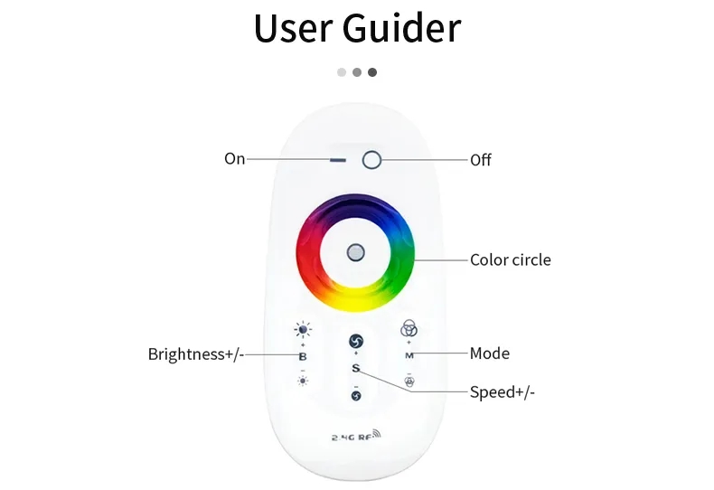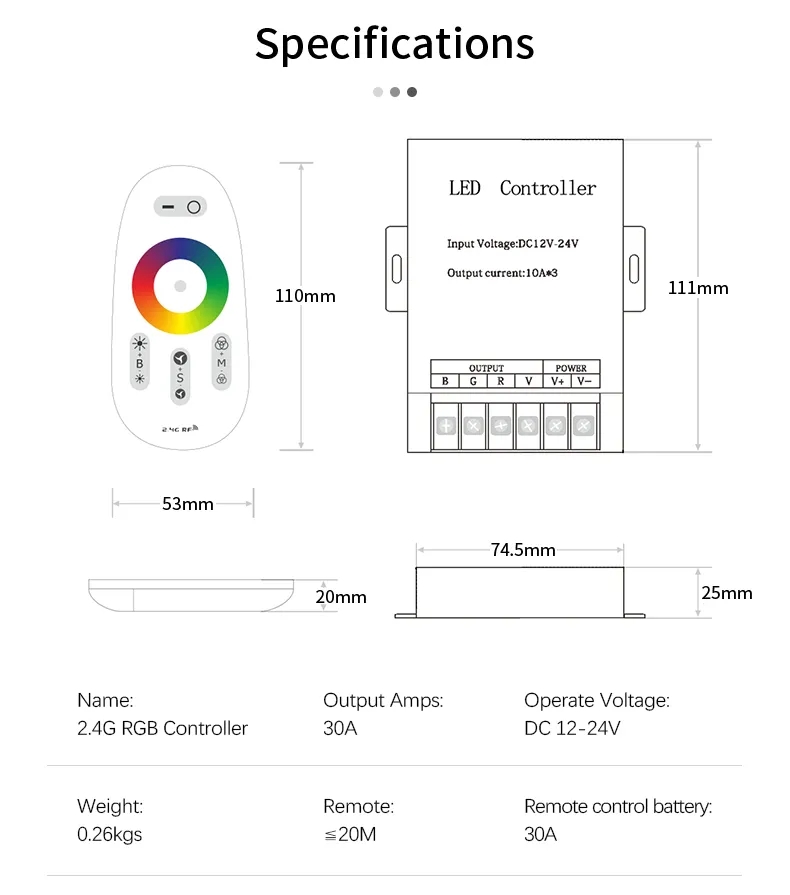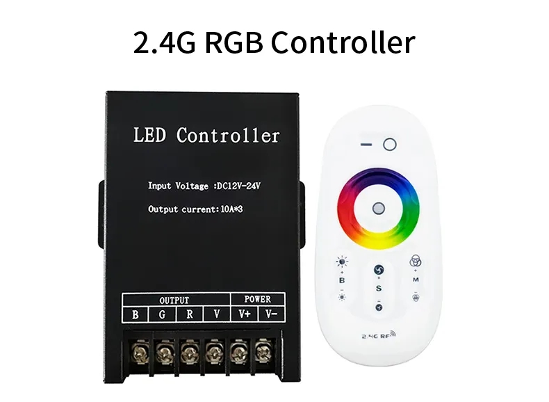 led rgb remote controller 12v 24v 10a 3CH output 720w color ring RF remote control 2.4g smd5050 rgb strip neon light controllerLuminous Efficacy(lm/w):1200 Product Weight(kg):0.26 Place of Origin:Guangdong, China Type:Remote Control Max. Load Power:720W Connection Mode:RF REMOTE CONTROL Voltage:DC12-24V Output Current:10A*3CH Output Channel:3CH/RGB Output Power:12V@360W/24V@720W Control Method:2.4G RF Remote Control Remote Control Keypad:8 keys+color ring Controller material:steel casing Certificate:Ce RoHS Control Distance:20m Measurement:51*32*32cm/13.8kg/carton
