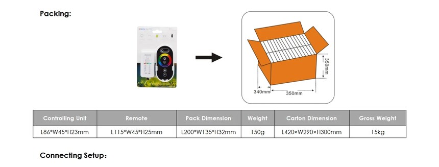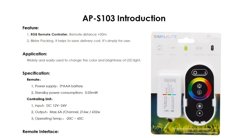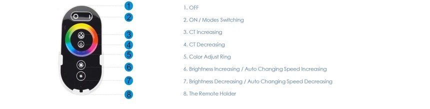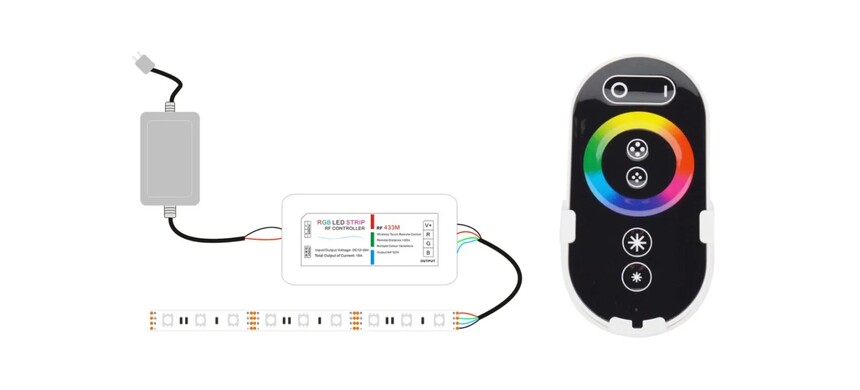 rgb led strip controller DC12-24V 18A 433mhz 6 Keys Touch RF Remote control Cob RGB LED Strip RF Controller with Remote HolderLuminous Efficacy(lm/w):1200 Product Weight(kg):0.13 Place of Origin:Guangdong, China Type:Remote Control Max. Load Power:122W, 144W Connection Mode:RF REMOTE CONTROL Voltage:DC12-24V Output Current:6A/CH, 144W@12Vdc Control mode:RF remote control kind:LED controller Warranty:2 years Output Power:96W Max@12AV dc 192W Max@24Vdc Material:Abs Plastic control area:20m Radio Frequency:433mhz