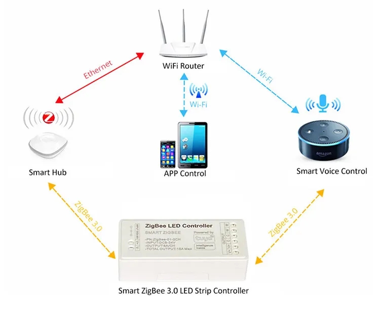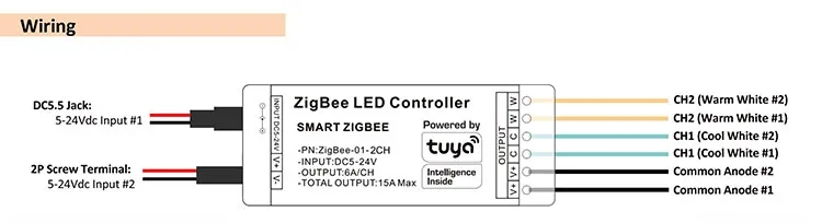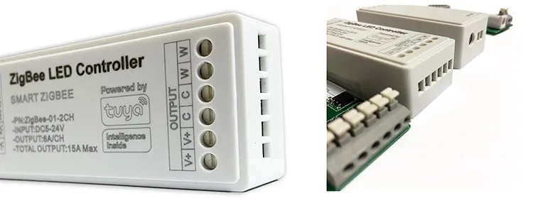 Tuya Zigbee Daul Colors LED Controller 15A 5-24V Smart Life Gateway Hub Color Temperature Cool Warm White CCT Strip ControllerEssential details Warranty(Year):3-Year Lighting solutions service:Lighting and circuitry design, LED Control Luminous Efficacy(lm/w):120 Product Weight(kg):0.12 Place of Origin:Guangdong, China Brand Name:OEM Type:Remote Control Max. Load Power:180W Connection Mode:ZigBee Operating Voltage:DC5-24V Output Current:6A/CH Output signal:Constant Voltage PWM Signal APP Name:Tuya SmartLife Voice Control Assistant:Alexa, Google, etc.. Connector:DC Jack, Push Clip Terminal Working temperature:-20°C ~ 60°C Smart Phone Connection:WiFi +Blue tooth Communication:Mesh Networks, ZigBee Certificates:CE ROHS