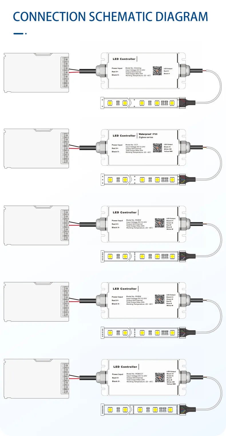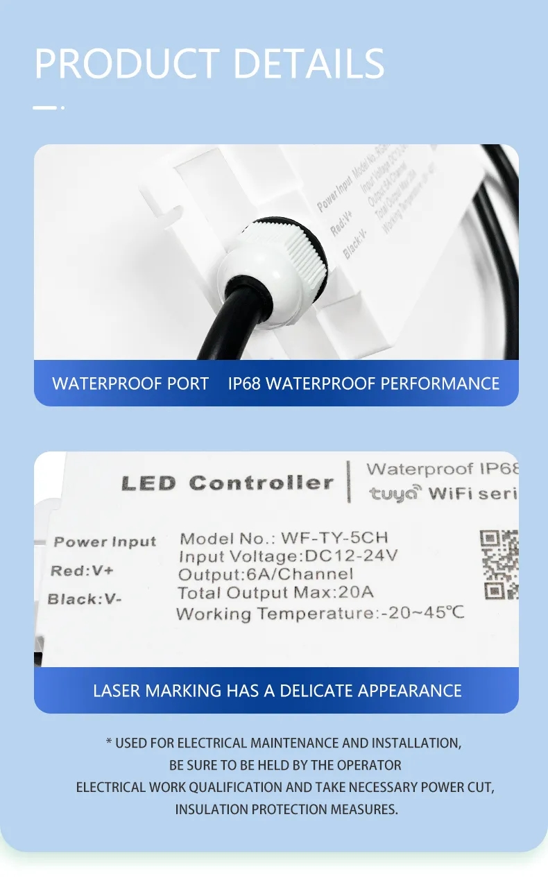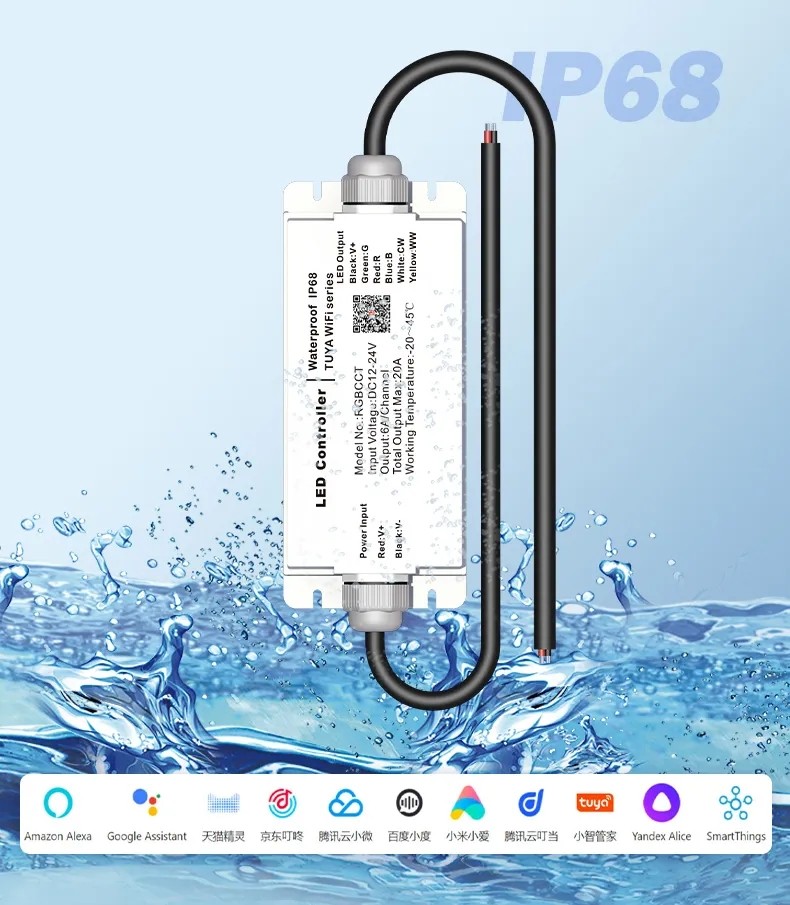 led controller rgbw tuya smart control wifi 12v 24v 6a 4 channel 576w ce rohs rgbw waterproof ip68 smd5050 led strips controllerWarranty(Year):1-Year Lighting solutions service:Lighting and circuitry design Luminous Efficacy(lm/w):1200 Product Weight(kg):0.27 Place of Origin:Guangdong, China Type:Water proof controller Max. Load Power:576W Connection Mode:WiFi Voltage:DC12-24V Output Current:6A/CH Max 20A Output Power:12V@288W/24V@576W Output Channel:4channels Waterproof Rate:IP68 control mode:WiFi,Tuya Smart APP,Remote Control,Voice Control Working Temperature:-20C - +45C Measurement:54*51.5*20cm/15kg/50pcs Certificate:CE RoHS Material:PVX
