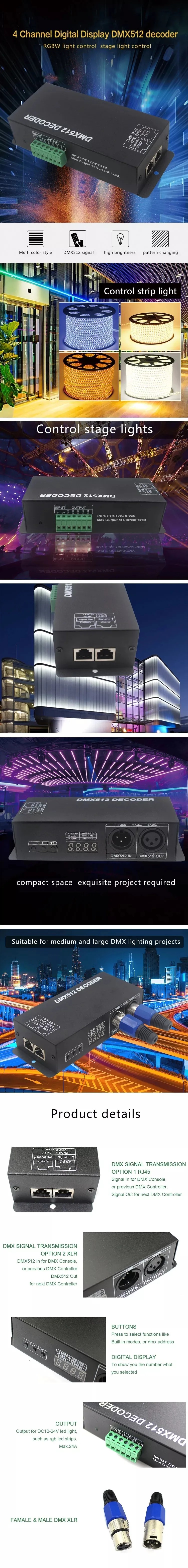 4A 4Channels PWM Control Signal Digital Display DMX512 DecoderWarranty(Year):2-Year Lighting solutions service:Lighting and circuitry design Product Weight(kg):0.45 Place of Origin:Guangdong, China Type:MANUAL SWITCH Max. Load Power:192W Product name:DMX 512 Decoder Application:DMX Lighting Solution Voltage:12-24V DC Output Current:4A/CH Output power::12V:<144W Certificates:CE ROHS Connection Mode:common anode Working temperature::-20C ~ 60C Color:Black Case Material::metal