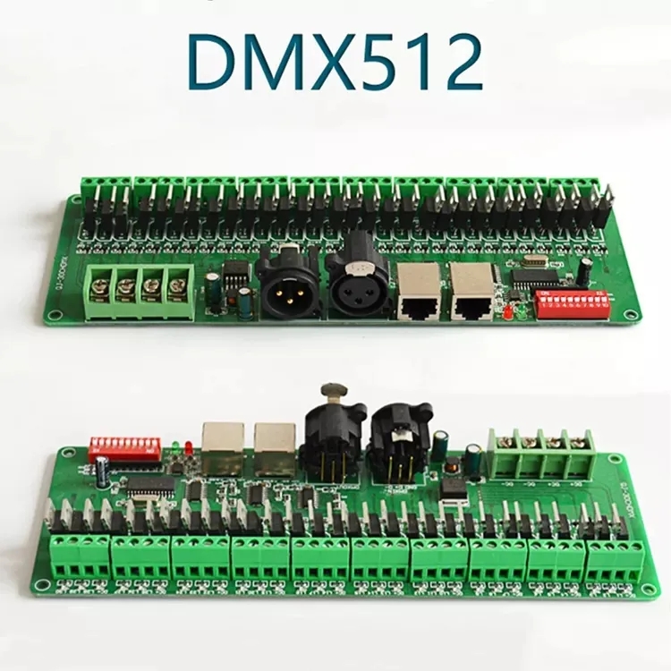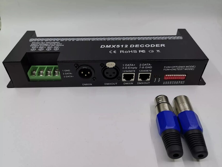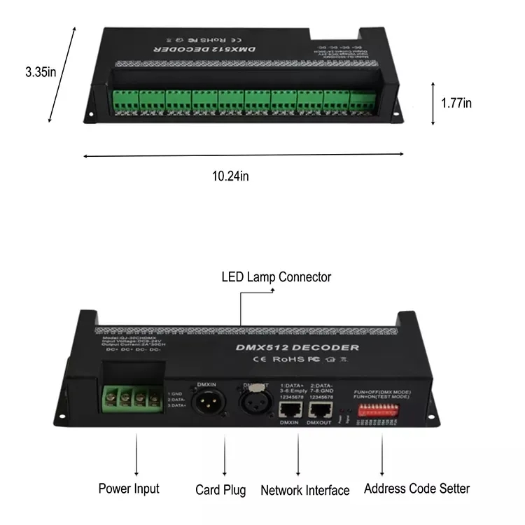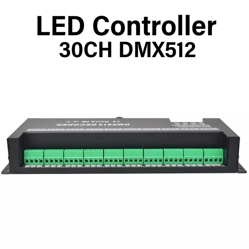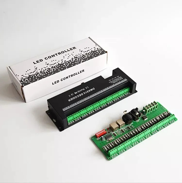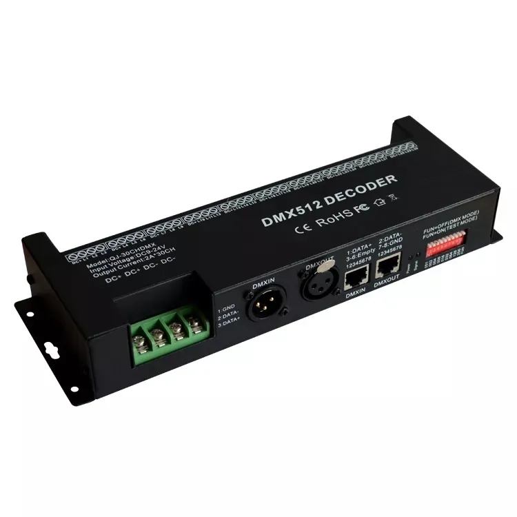 DMX512 DECODERTechnical Parameters ● Working temperature: -20-60 ℃ ● Supply voltage: DC9-24V ● Output:30 channels ● Net weight: 900g ● Gross weight: 1000g ● Static power consumption: <1W ● Output current: 2A/CH 30CH ● Output power(RGBW): 1440W ●DMX512standard:DMX512/1990 Detailed Images